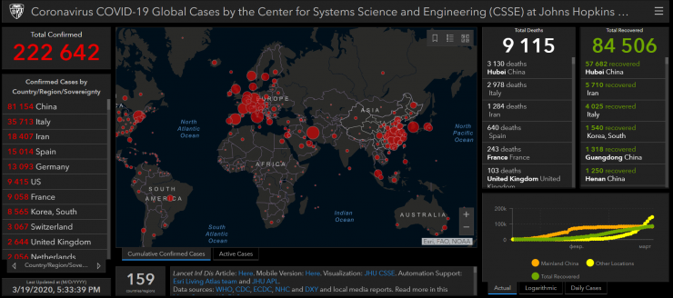 В мире число зараженных превысило 222 тысячи человек. Больные регистрируются в 159 странах. В Китае количество больных почти не увеличилось, уже несколько дней отметка держится на уровне 81,1 тысячи человек. В Италии, напротив, количество новых зараженных за сутки превысило 4 тысячи, всего в стране 35,7 тысячи больных. Также в стране значительно возросла суточная смертность.
