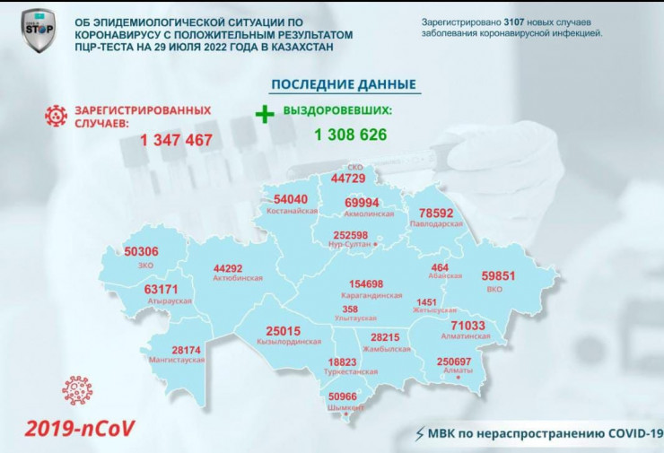 В Казахстане за прошедшие сутки (29 июля) зарегистрировано 3107 новых случаев заболевания коронавирусной инфекцией, передает Tengrinews.kz со ссылкой на данные МВК по нераспространению COVID-19.