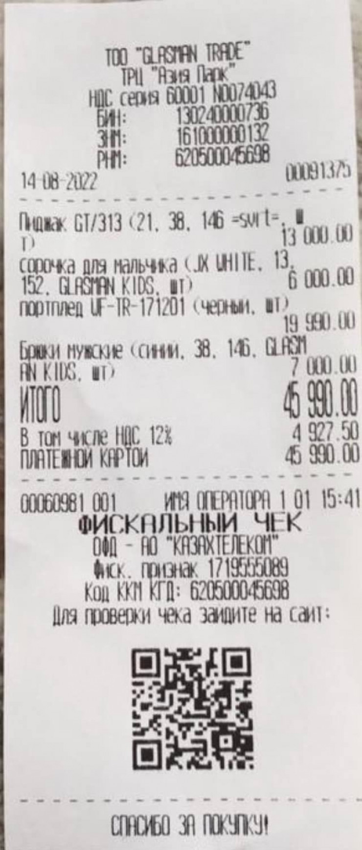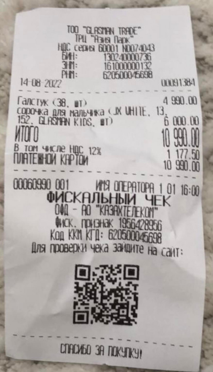 "В воскресенье мы вместе с сыном приобрели в магазине рубашки, костюм, брюки и галстук на сумму порядка 36 тысяч тенге. В приложенных чеках можно увидеть стоимость и подсчитать общую сумму. Также, кроме школьной формы, в чеке можно увидеть приобретенный портплед для костюмов на сумму около 20 тысяч тенге.