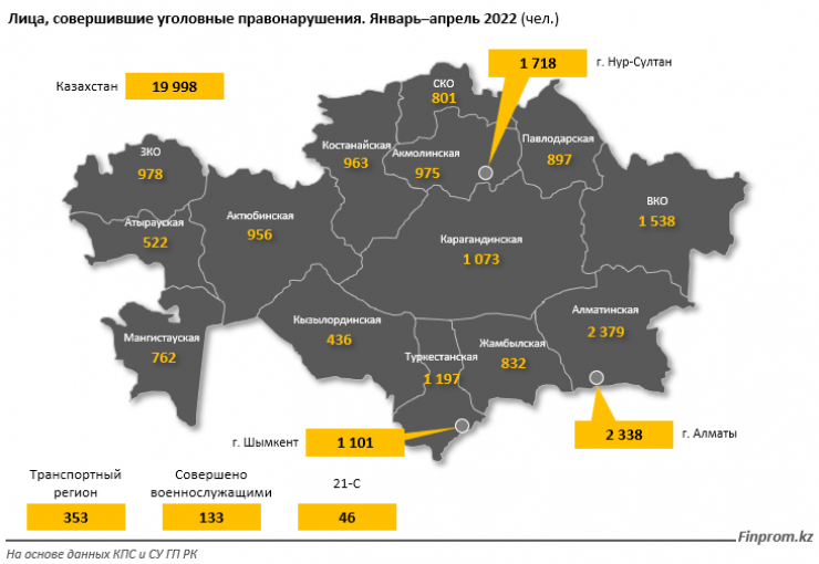 Меньше всего преступников пришлось на Кызылординскую область: 436 человек против 466 человек годом ранее.