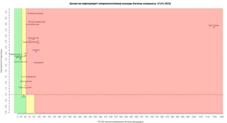 Согласно матрице оценки эпидемиологической ситуации в регионах Казахстана на 13 января 2022 года:
