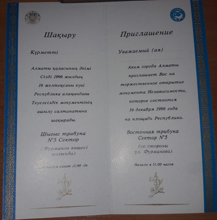 Пригласительный билет на открытие монумента Независимости. 1996 год. Фото предоставлено Центральным государственным музеем РК