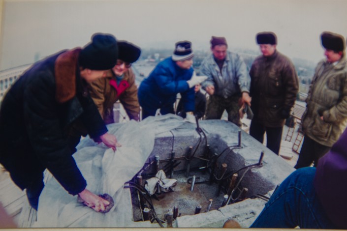 Перед установкой Золотого воина на вершине стелы строители проверяли готовность основы. Фото из альбома Болата Сауранбаева
