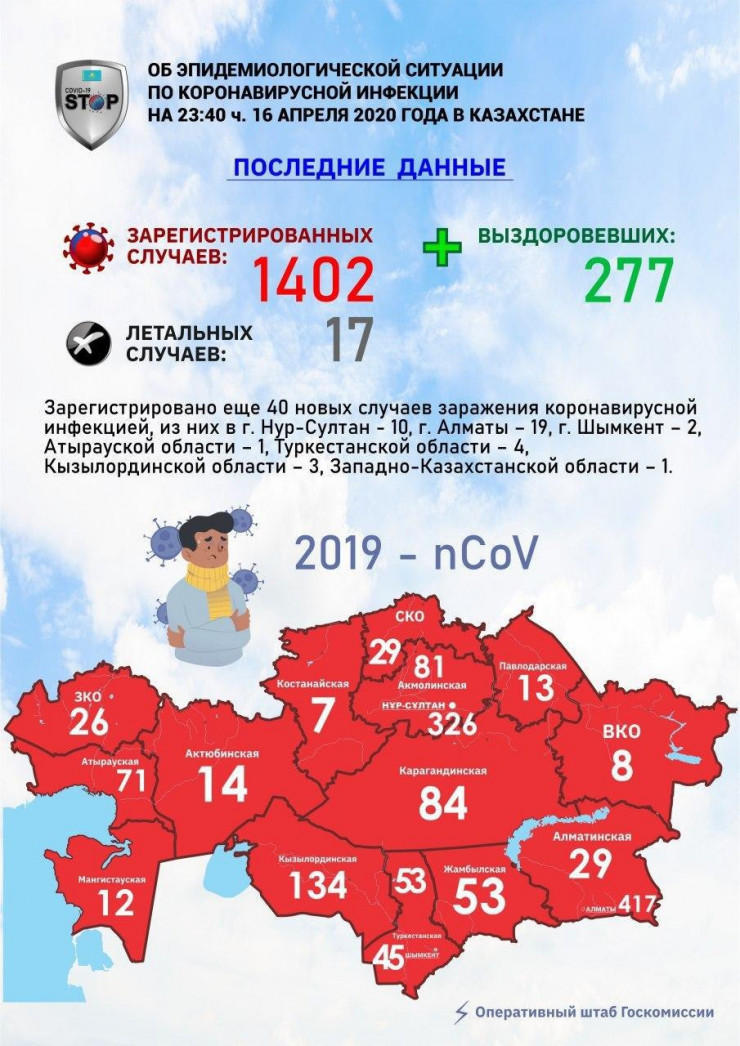 По состоянию на 23:40 16 апреля в Казахстане выявили еще 40 новых случаев заражения коронавирусной инфекцией, сообщает оперативный штаб Госкомиссии.