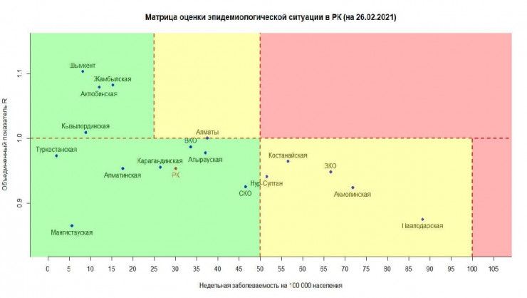 Согласно матрице оценки эпидемиологической ситуации по COVID-19 в регионах Казахстана, по состоянию на 21 января сложилась следующая ситуация: