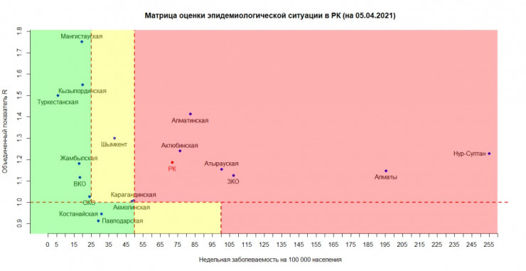 Согласно матрице оценки эпидемиологической ситуации в регионах Казахстана на 5 апреля, в "красной" зоне находятся Нур-Султан, Алматы, Алматинская, Атырауская, Актюбинская и Западно-Казахстанская области.