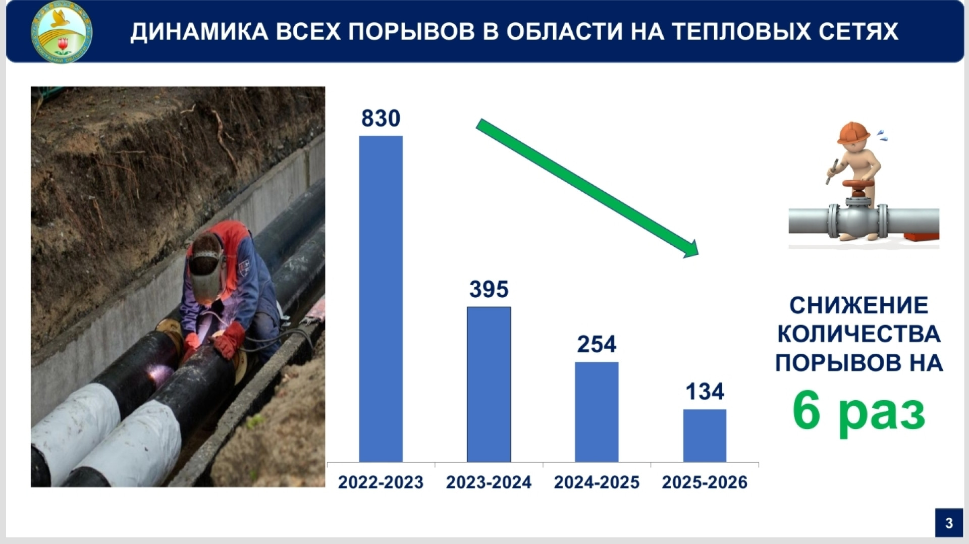 "Количество повреждений тепловых сетей по области снижено в 6 раз: с 830 в отопительном сезоне 2022–2023 годов до 134 в текущем", — сообщил глава региона.