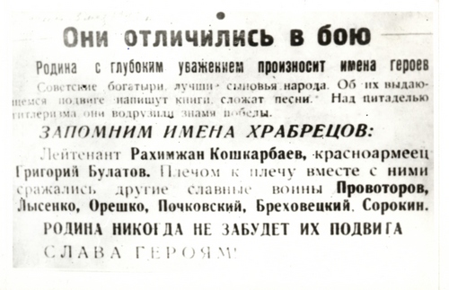 Лишь спустя годы время стало расставлять для широкой общественности все по своим местам. По инициативе героя обороны Москвы панфиловца Бауыржана Момышулы тогда еще молодой казахстанский журналист Какимжан Казыбаев написал первую послевоенную статью "Подвиг молодого казаха", которая в 1958 году была опубликована в газете "Лениншіл жас". Советский Союз вновь узнал о героях.