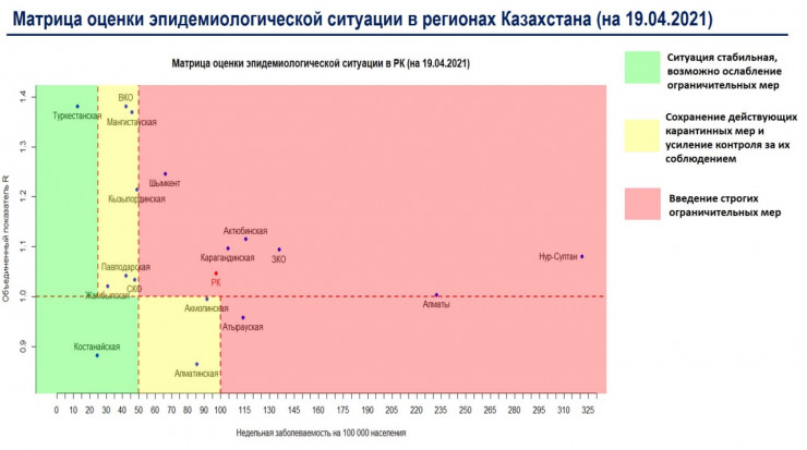 Согласно матрице оценки эпидемиологической ситуации в регионах Казахстана на 19 апреля, в "красной" зоне находятся Нур-Султан, Алматы, Шымкент и Атырауская, Актюбинская, Западно-Казахстанская, Карагандинская области.