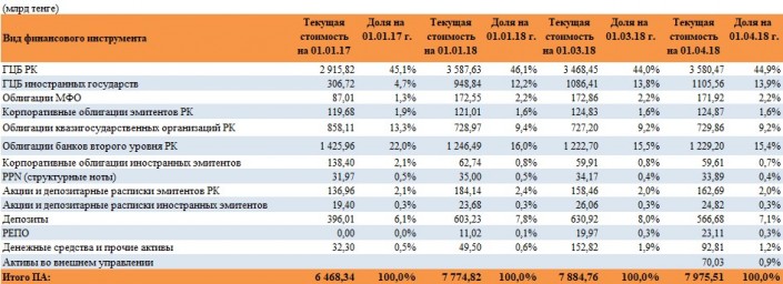 К началу апреля суммарные пенсионные накопления граждан Казахстана составили 7 974,07 миллиарда тенге, увеличившись на 2,5 процента с начала года. За 2017 год пенсионные накопления выросли на 16,4 процента, или 1 095,5 миллиарда тенге.