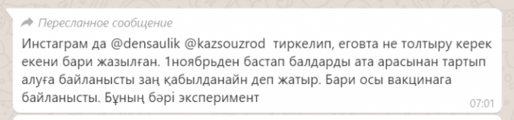 "Бұл ақпарат жалған. Мектептерде балаларға вакцина міндеттеп салынбайды. Мектептер балаларға білім береді, әлеуметке сіңісуге көмектеседі. Бала ата-анасының рұқсатынсын вакцина салу туралы әңгіме қозғалған да жоқ", - деді ведомство өкілдері.