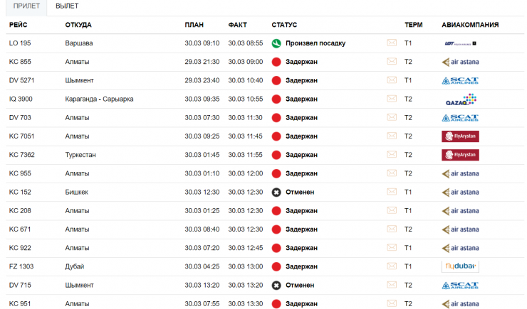 "На данный момент аэропорт работает в штатном режиме, однако есть задержка рейсов. На прилет задерживаются 36 рейсов, на вылет - 28. Отменены 16 рейсов. Причина: метеоусловия в столице и позднее прибытие воздушного судна", - сообщил Шалекенов.