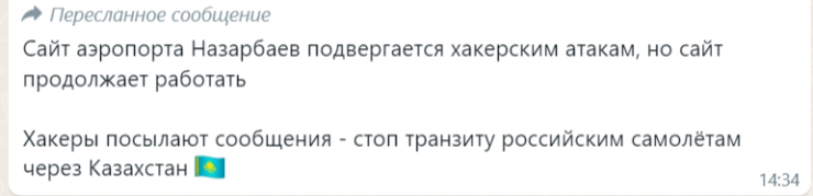 В мессенджере WhatsApp казахстанцы рассылают сообщение о том, что на сайт Международного аэропорта Нурсултан Назарбаев была совершена хакерская атака, в ходе которой российским самолетам, пролетающим транзитом через Казахстан, якобы отправлялись сигналы "стоп", передает Tengrinews.kz со ссылкой на Stopfake.kz.