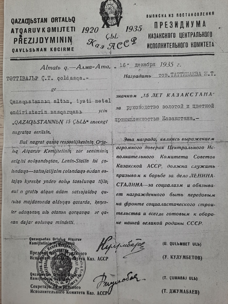 Ал, әкемнің атылғанын ешкім білген жоқ, анамның қолында әкемнің 1943 жылы майданда қайтыс болғаны туралы құжат қана болды. Кейін мұрағаттың бәрі ашылғанда әкемнің атылғанын білдік.