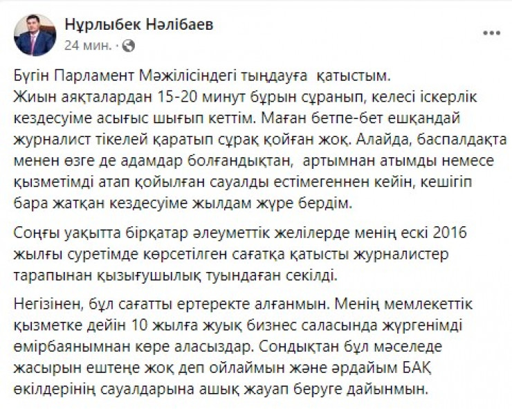 Позже на своей странице в Facebook Нурлыбек Налибаев прокомментировал ситуацию.