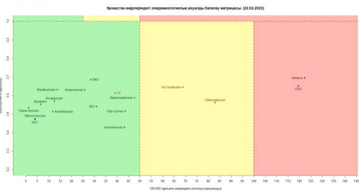 Согласно матрице оценки эпидемиологической ситуации в регионах Казахстана на 22 февраля, в "красной" зоне находятся Алматы и Северо-Казахстанская область.