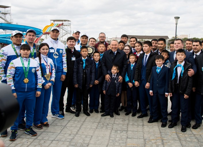 В спортивно-развлекательном комплексе "Арай" состоялась встреча Елбасы с молодежью региона, в том числе с серебряным призером чемпионата мира по боксу Камшыбеком Конкабаевым, молодым бизнесменом Айдосом Сайлигараевым и воспитанницей детской деревни "Атамекен", ныне студенткой Российского государственного аграрного университета Наргиз Кашаповой.
