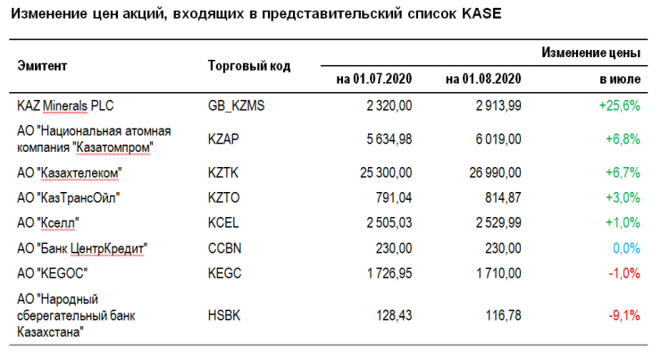 В Казахстанской фондовой бирже (KASE) назвали компании, акции которых больше всего подорожали или упали в цене за июль 2020 года, передает корреспондент Tengrinews.kz.