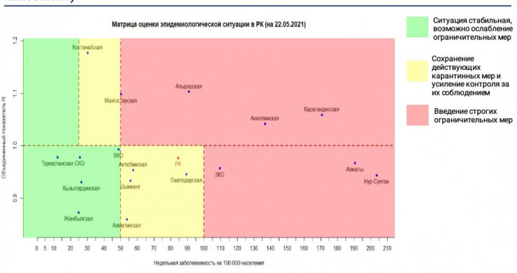 Актюбинская область перешла из "красной" зоны в "желтую", Мангистауская - наоборот, из "желтой" зоны в "красную" по коронавирусу. Об этом свидетельствуют данные матрицы оценки эпидемиологической ситуации в регионах Казахстана на 22 мая 2021 года, передает корреспондент Tengrinews.kz.