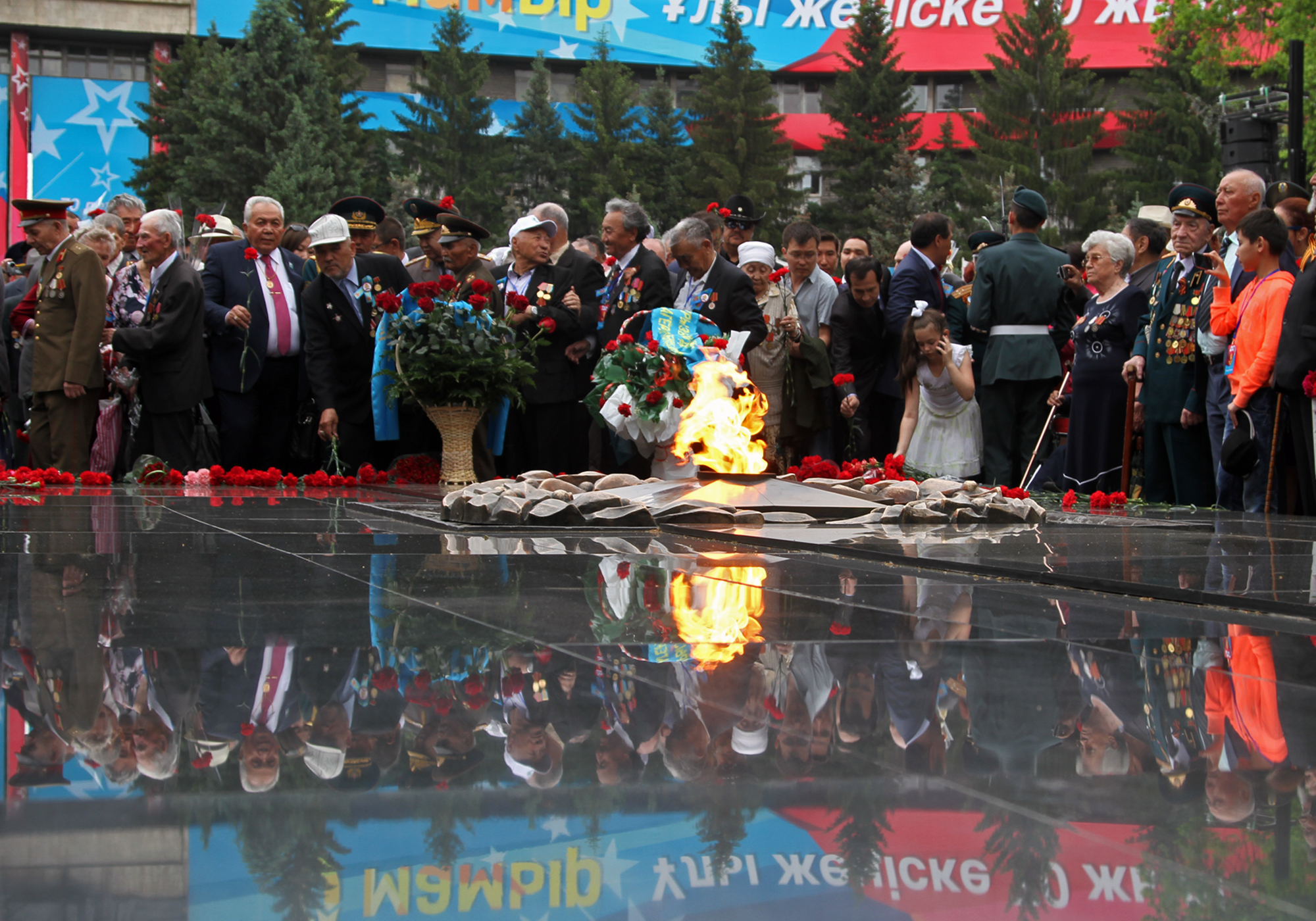После речи градоначальника прозвучал гимн Казахстана. Затем состоялось возложение цветов. Всего в парк сегодня пришли более 5000 человек, чтобы послушать и спеть песни военных лет. Собравшиеся поздравляли ветеранов и кричали "Спасибо!". В парке организовали праздничный обед для ветеранов и концерт. Полевую кухню развернули возле Свято-Вознесенского собора. Также сегодня, 9 мая, на площади Астана в 20.00 начнется праздничный концерт. А залпы юбилейного салюта будут даны в 22.00 одновременно с двух точек мегаполиса - площади Астана и озера Сайран.