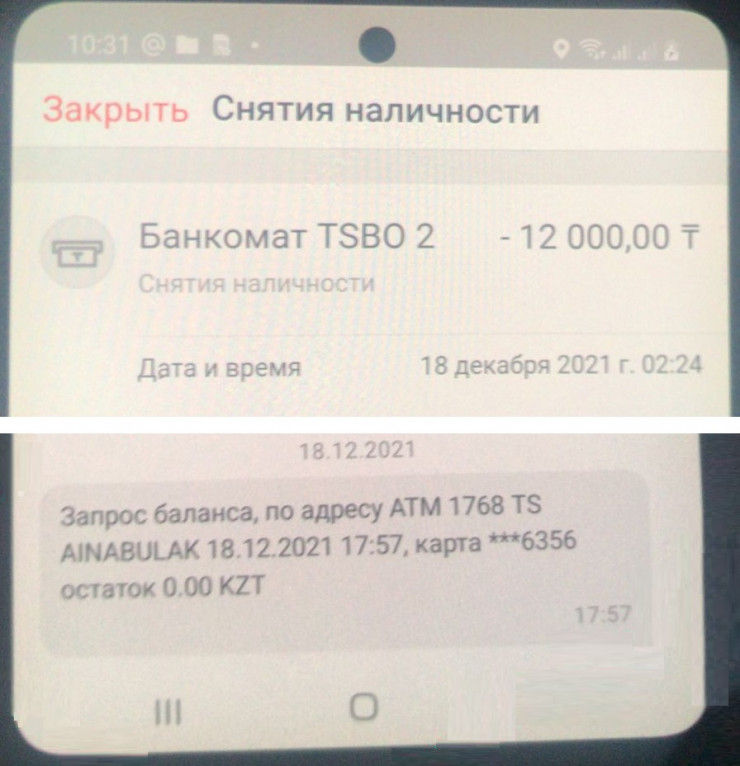 "На утро следующего дня муж смотрит уведомления на телефоне, что в 02.24 ночи кто-то снял с его карточки в банкомате все 12 тысяч тенге, которые были на счету. Также чуть ранее с другой карточки злоумышленник в 18.00 проверял баланс, сколько есть на счету. Но это уведомление муж тоже увидел только на следующий день, потому что был занят поисками авто.