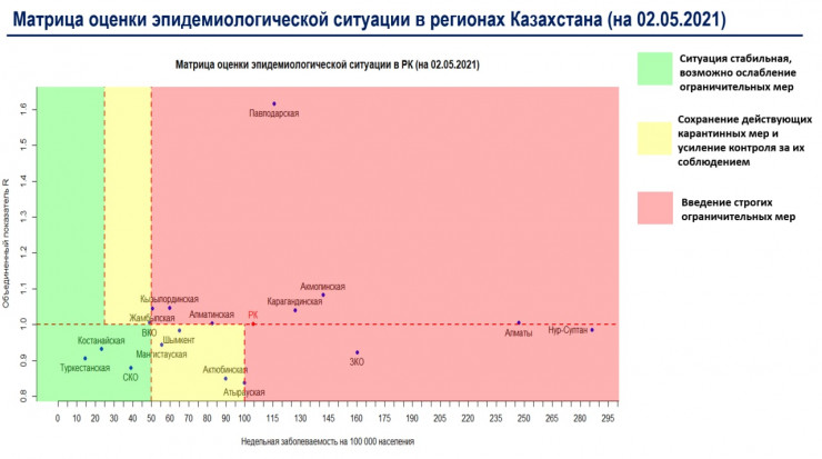 Таким образом, в "красной" зоне находятся: города Нур-Султан и Алматы, Акмолинская, Алматинская, Западно-Казахстанская, Карагандинская, Кызылординская, Павлодарская области.