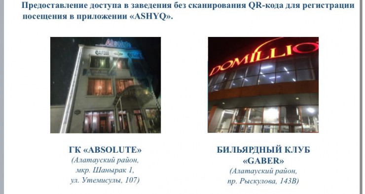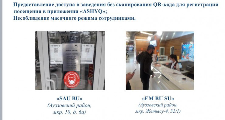 "Изначально пилотный проект Аshyq должен был позволить санитарным врачам наладить аналитику и определить, как оптимизировать текущие санитарные ограничения. В ходе визита на объектах, которым были выданы QR-коды на входные группы, были выявлены нарушения. Среди них: предоставление доступа в заведения без сканирования QR-кода для регистрации посещения в приложении Ashyq и несоблюдение масочного режима сотрудниками и посетителями", - сообщили в пресс-службе акимата.
