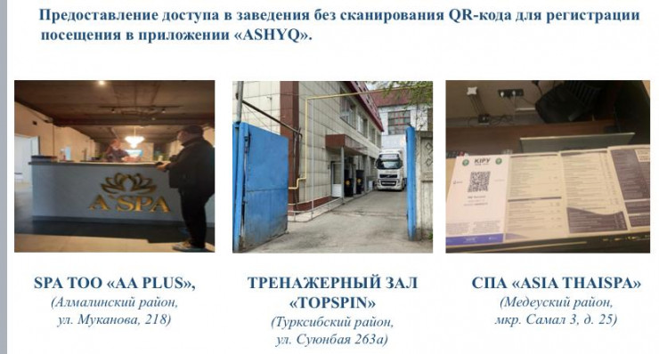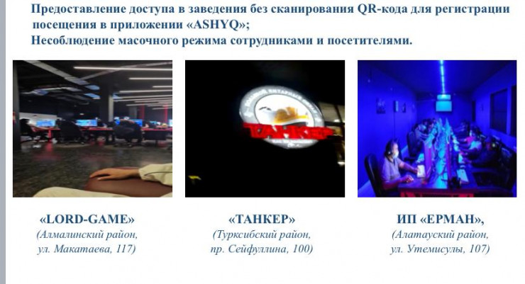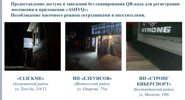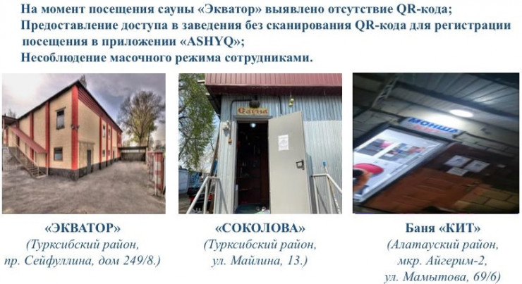 Нарушения допустило руководство бани EM BU SU, Sau bu, "Кит", саун "Экватор", "Соколова", спа- и фитнес-клубов AA PLUS, "Тренажерного зала Topspin", Asia ThaiSpa, гостиничного комплекса Absolute и бильярдного клуба Gaber, а также компьютерных клубов Lord Game, Clickme, "Танкер", ИП "Стронг Киберспорт", ИП "Ерман" и ИП "Елеуисов".