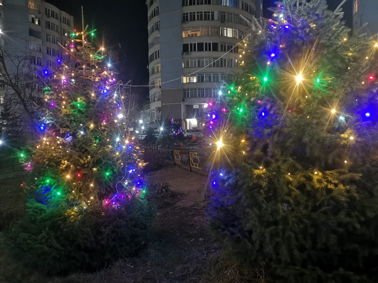 Некоторые горожане не стали дожидаться праздничного украшения от городских властей или бизнеса, а самостоятельно установили иллюминацию на елках у себя во дворе, как в ЖК "Хан-Тенгри".