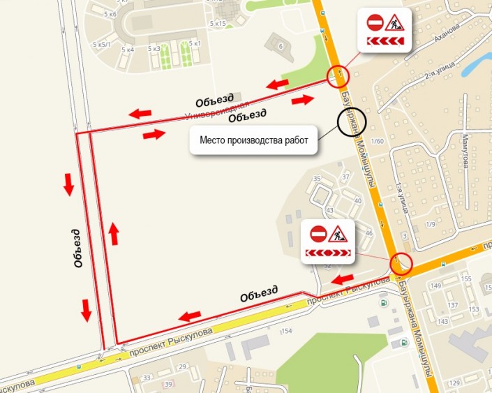 Также, по данным пресс-службы акима Алматы, в связи с производством работ по монтажу пролетного строения надземного пешеходного перехода по улице Момышулы – севернее проспекта Рыскулова с 23.00 часов 23.06.2017 года до 06.00 часов 24.06.2017 года движение автотранспорта по улице Момышулы от проспекта Рыскулова до Ледового дворца "Алматы Арена" в северном и южном направлениях будет временно перекрыто. Объезд будет осуществляться согласно приложенной схеме.