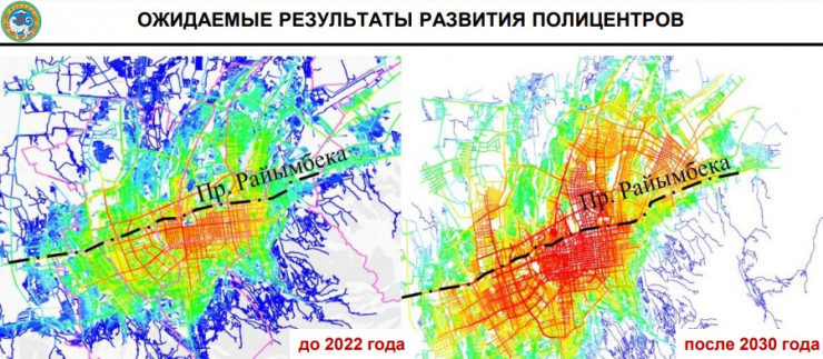 "Так, специализация полицентра "Север", расположенного севернее проспекта Райымбек батыра, который планируется полностью модернизировать до конца 2026 года, охватывает частично Жетысуский и Турксибский районы и будет включать в себя редевелопмент индустриальных территорий и территорий с ветхим и индивидуальным жильем советского периода.