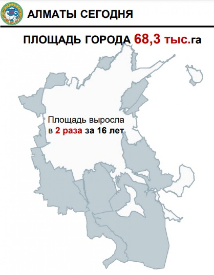 По данным акимата, с 1998 года мегаполис стал вдвое больше. К нему присоединилось 27 населенных пунктов. Как отметил Азирбаев, вместе с территорией к городу перешли и проблемы, связанные с отсутствием инженерной, транспортной, жилой и социальной инфраструктуры.