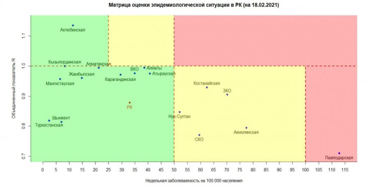 В "красной" зоне по коронавирусу 18 февраля остается только Павлодарская область. При этом Алматы, судя по матрице оценки эпидситуации, приближается к "желтой" зоне, передает Tengrinews.kz со ссылкой на данные Межведомственной комиссии по нераспространению коронавируса.