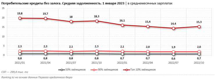 При рассмотрении соотношения займов с заработками становится еще заметнее, что долговая нагрузка на казахстанцев не только не выросла, но и, напротив, ощутимо сократилась. Для 10 процентов заемщиков с максимальным объемом займов задолженность в среднемесячных заработных платах составила 15,3 месячного показателя, против 18,3 зарплаты годом ранее.