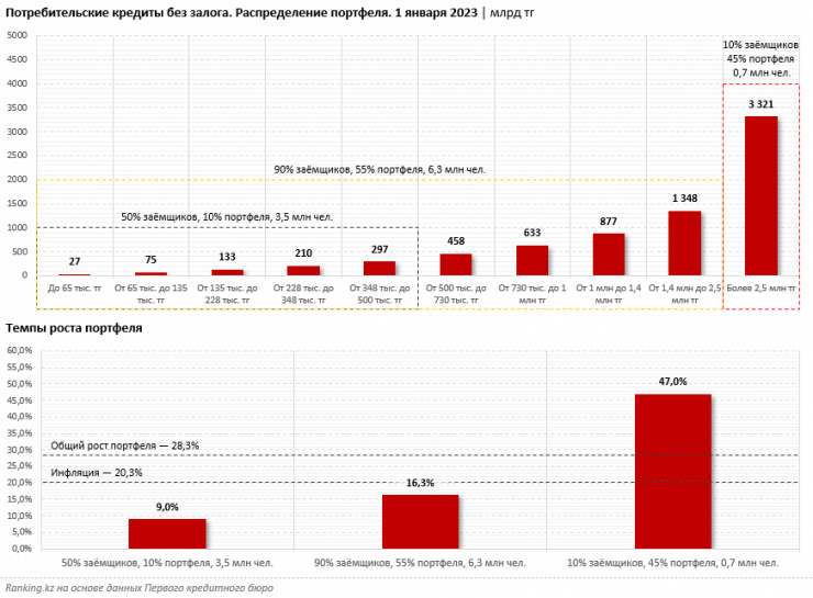 В состав оставшихся 90 процентов заемщиков входят 6,3 миллиона человек, но на них приходится лишь 55 процентов портфеля (около 4,1 триллиона тенге). В 2022 году портфель займов в этом сегменте вырос лишь на 16,3 процента, что ниже темпов инфляции (20,3 процента).