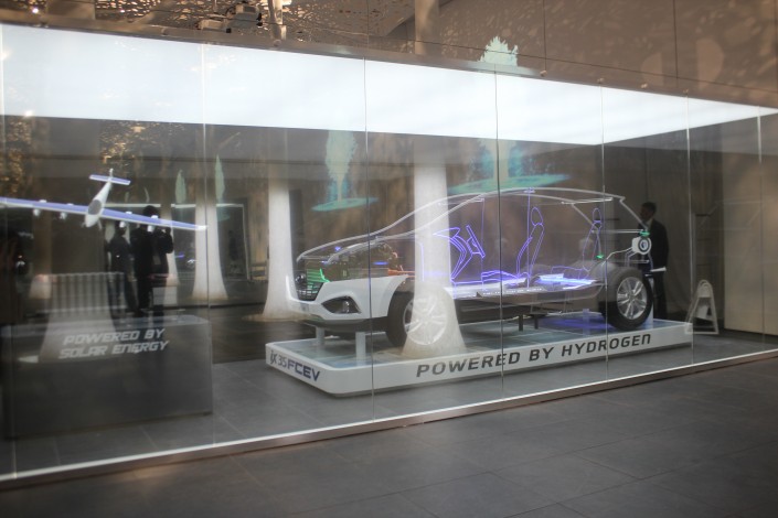 Здесь же представлена действующая модель автомобиля будущего от Hyundai, работающего на водородном топливе.