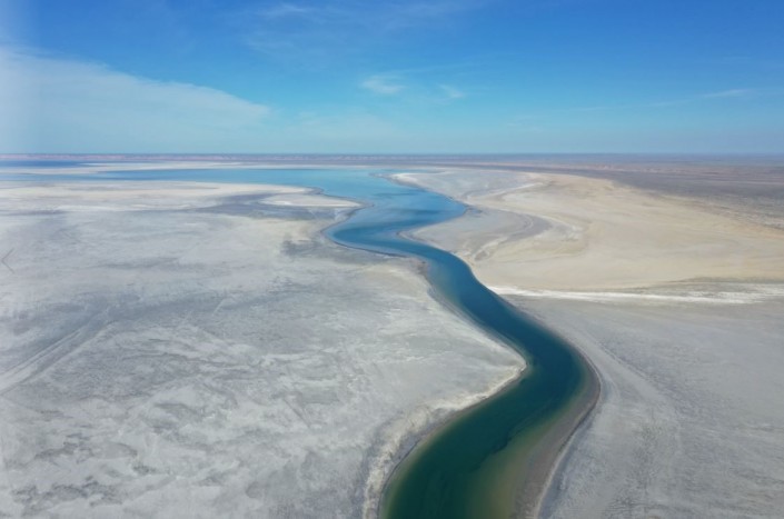 Протока, соединяющая Южный и Северный Арал, май 2019