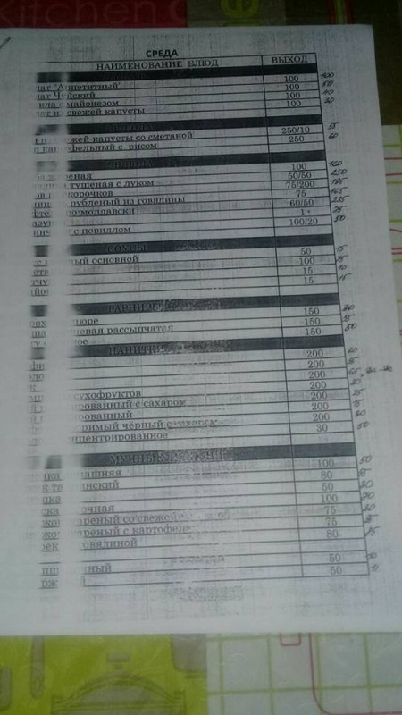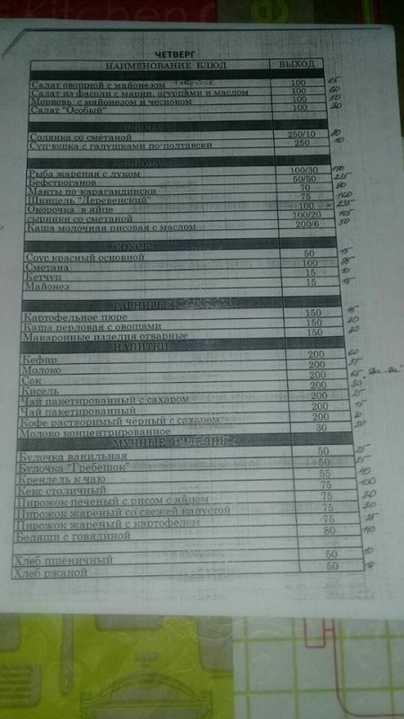 На снимках представлено меню с понедельника по пятницу. Так, стоимость первых блюд начинается от 50 тенге за порцию и не превышает 135 тенге (самое дорогое), а вторых (без гарнира) не превышает 265 тенге (самое дорогое). Цена салатов - от 30 до 190 тенге.