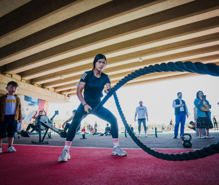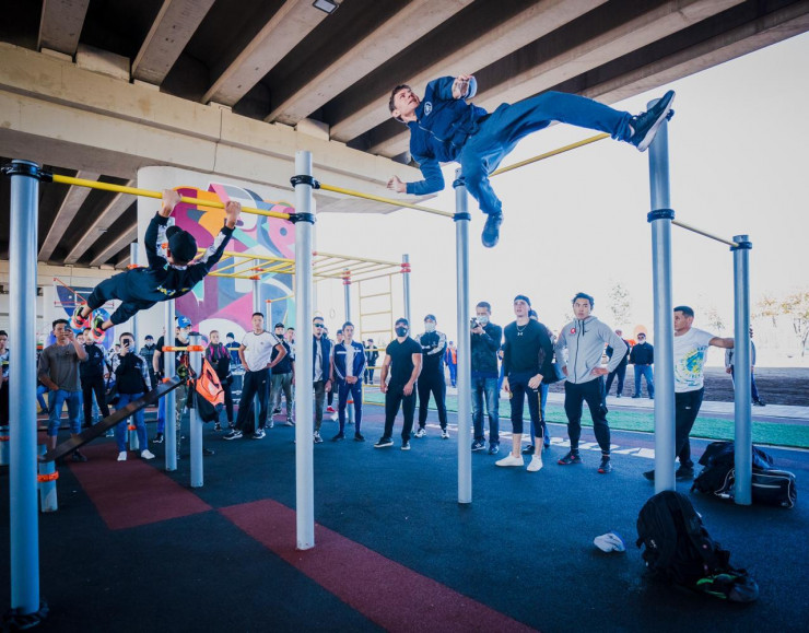 Подмостовое пространство (проспект Сарайшик) разделили на пять зон: это баскетбольные зоны, детские, work-out, территория для танцоров со сценой, для занятия йогой и так далее. Также установили точку общепита.