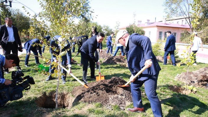 Аскар Мамин совместно с акимом Туркестанской области Умирзаком Шукеевым и министром экологии, геологии и природных ресурсов Магзумом Мирзагалиевым посадил деревья на аллее имени Н. Ондасынова, дав старт республиканской акции по посадке деревьев.