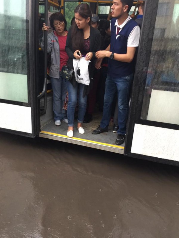 "Лодку что-ли купить. Все время мечтала о машине, придется, видимо, лодку. Пассажиры в раздумье, как выйти из автобуса на "Хабаре", - написала другая жительница Астаны в Facebook Бота Ибраева, иллюстрируя таким фото.