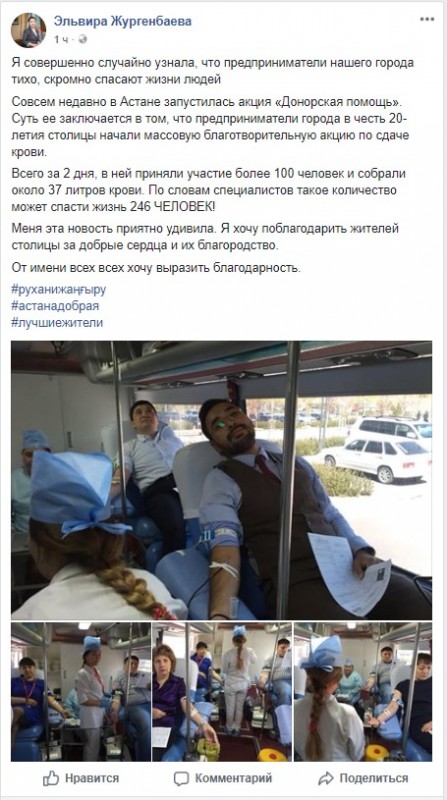 Столичные бизнесмены сдали около 37 литров крови, участвуя в акции "Донорская помощь". Об этом на своей страничке в Facebook написала руководитель пресс-службы акимата Астаны Эльвира Жургенбаева, передает корреспондент Tengrinews.kz.