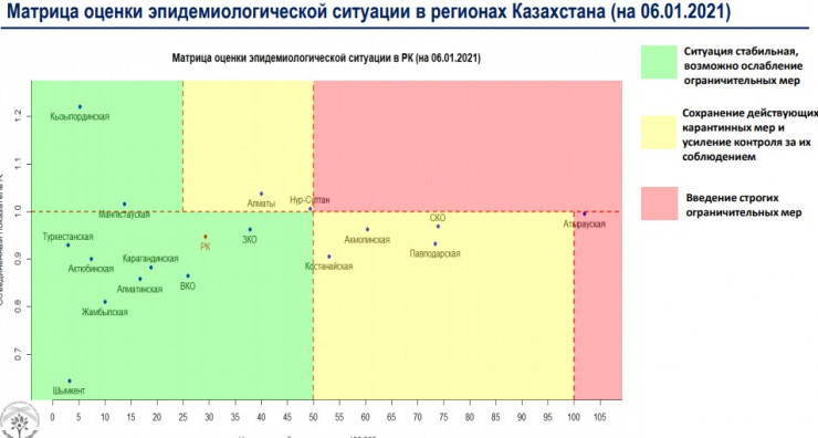 В "желтой" зоне на сегодняшний день находятся Алматы, Нур-Султан, Акмолинская, Костанайская, Павлодарская и Северо-Казахстанская области. В "зеленую" попали все остальные регионы.