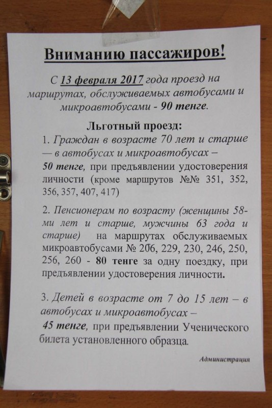 Объявления о повышении стоимости проезда в автобусах и маршрутных такси запечатлели многие горожане. Сразу несколько перевозчиков разместили информацию в салонах транспортных средств. Объявление гласит, что уже с будущего понедельника цена за проезд увеличится с 75 тенге до 90. Решение об увеличении стоимости тарифа ранее действительно принял местный маслихат. Но до сегодняшнего дня точная дата изменения цены оставалась неизвестна.