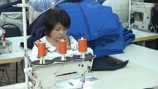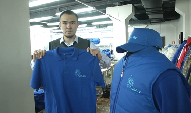 "Этот логотип разрабатывался в специальной компьютерной программе, то есть размеры все точно указаны в этой программе и они неизменны. На всех изделиях одинаковыми нитками, одинакового размера. С помощью вот этой машины вышивальной 6-головочной мы сразу ставим 56 изделий и одновременно 6 изделий вышиваются", - сказал директор швейной фабрики Арман Жылкибаев.