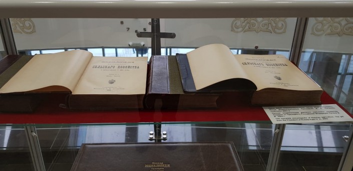 Фонд музея Темиртау пополнился и другими ценными экспонатами. Например, подарок Назарбаеву от Владимира Путина - антикварная 12-томная энциклопедия российского сельского хозяйства, выпущенная в Санкт-Петербурге в начале XX века. Названия книг оттиснены на кожаных корешках золотыми буквами. Обрез украшен рисунком под мрамор.