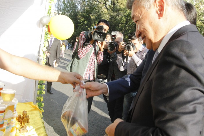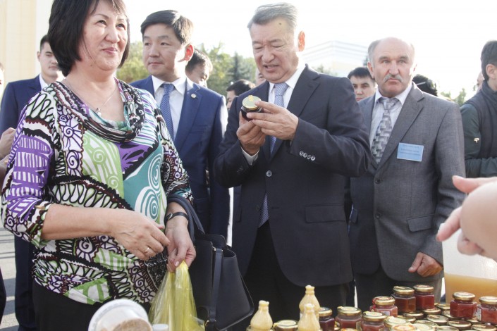 По ярмарке прошлись акимы Даниал Ахметов и Бауыржан Байбек, которые попробовали несколько сортов меда. Пчеловоды подарили главе города около пяти килограммов меда.