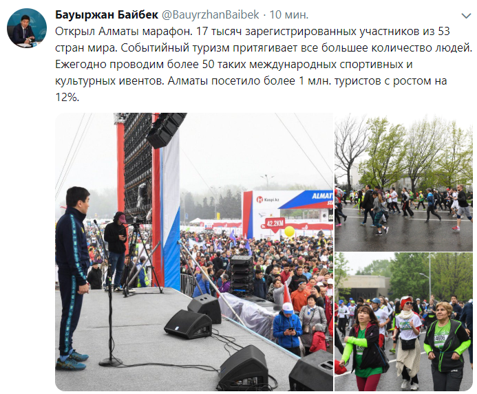 "Открыл Алматы марафон. 17 тысяч зарегистрированных участников из 53 стран мира. Событийный туризм притягивает все большее количество людей. Ежегодно проводим более 50 таких международных спортивных и культурных ивентов. Алматы посетило более 1 млн. туристов с ростом на 12 процентов", - написал Бауыржан Байбек в своем аккаунте.