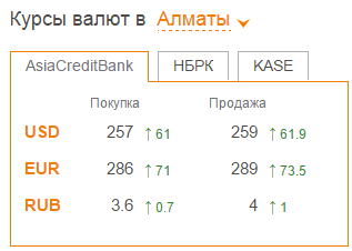 Курс доллара на сайтах казахстанских банков на продажу достигает 259 тенге, передает корреспондент Tengrinews.kz. Напомним, по итогам утренней сессии KASE средневзвешенный курс доллара составил 255,26 тенге. Отметим, на пресс-конференции 20 августа 2015 года глава Нацбанка Кайрат Келимбетов напомнил, что установленную разницу между покупкой и продажей доллара в 2 тенге отменять не будут. Так, курс доллара на сайте банка AsiaCredit Bank на продажу достиг 259 тенге. Покупают иностранную валюту за 257. Аналогичная ситуация и на портале Qazaq Banki.