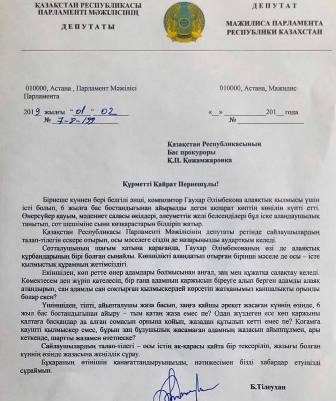 "Қазақстан Республикасы Парламенті Мәжілісінің депутаты ретінде сайлаушылардың талап-тілегін ескере отырып, осы мәселеге сіздің де назарыңызды аудартқым келеді. Сотталушының шағым хатына қарағанда, Гаухар Әлімбекованың өзі де алаяқтық құрбандарының бірі болған сыңайлы. Көпшілікті алаңдатып отырған бірінші мәселе де осы - істе қылмыстық құрамның жетімсіздігі", - делінген депутаттың сауалында.